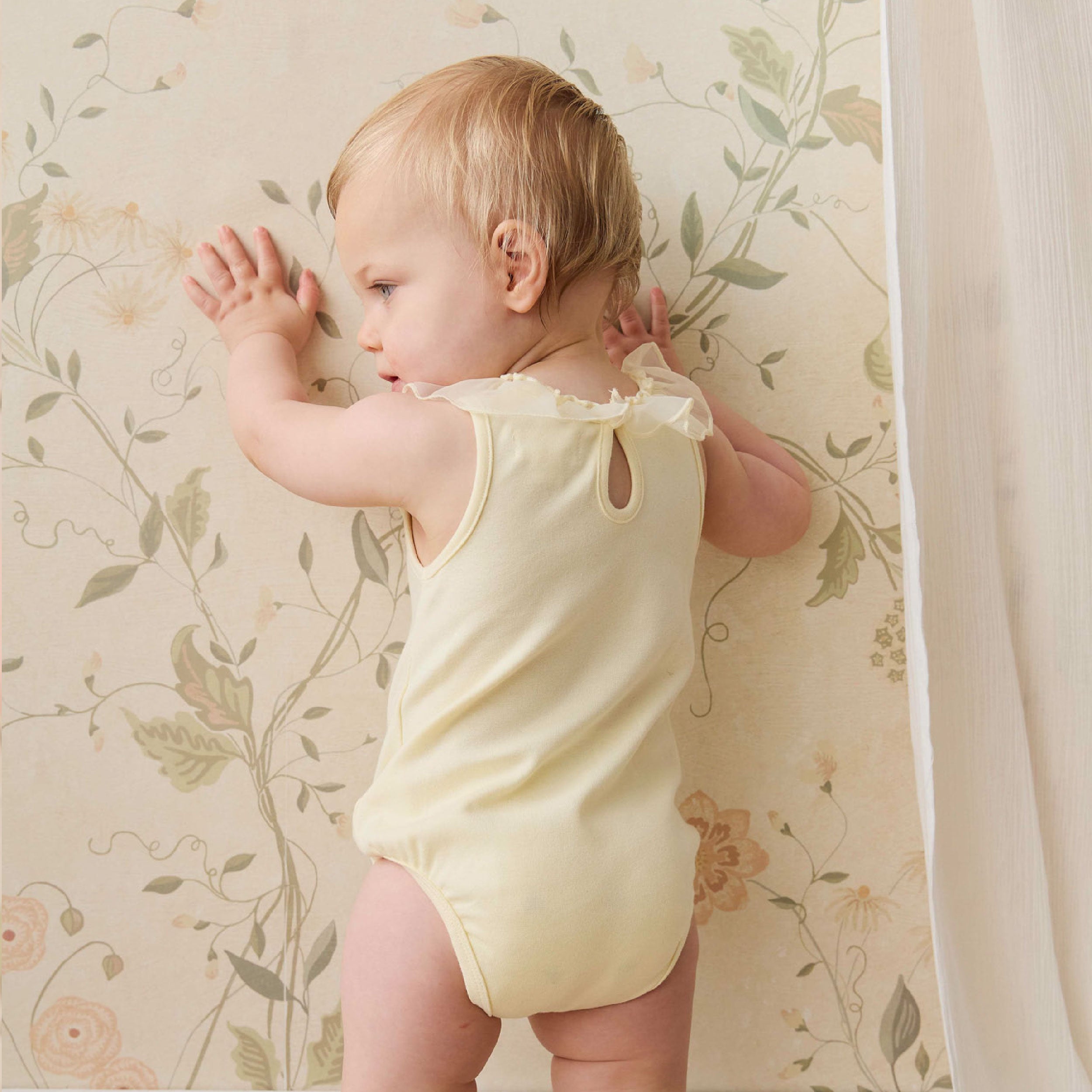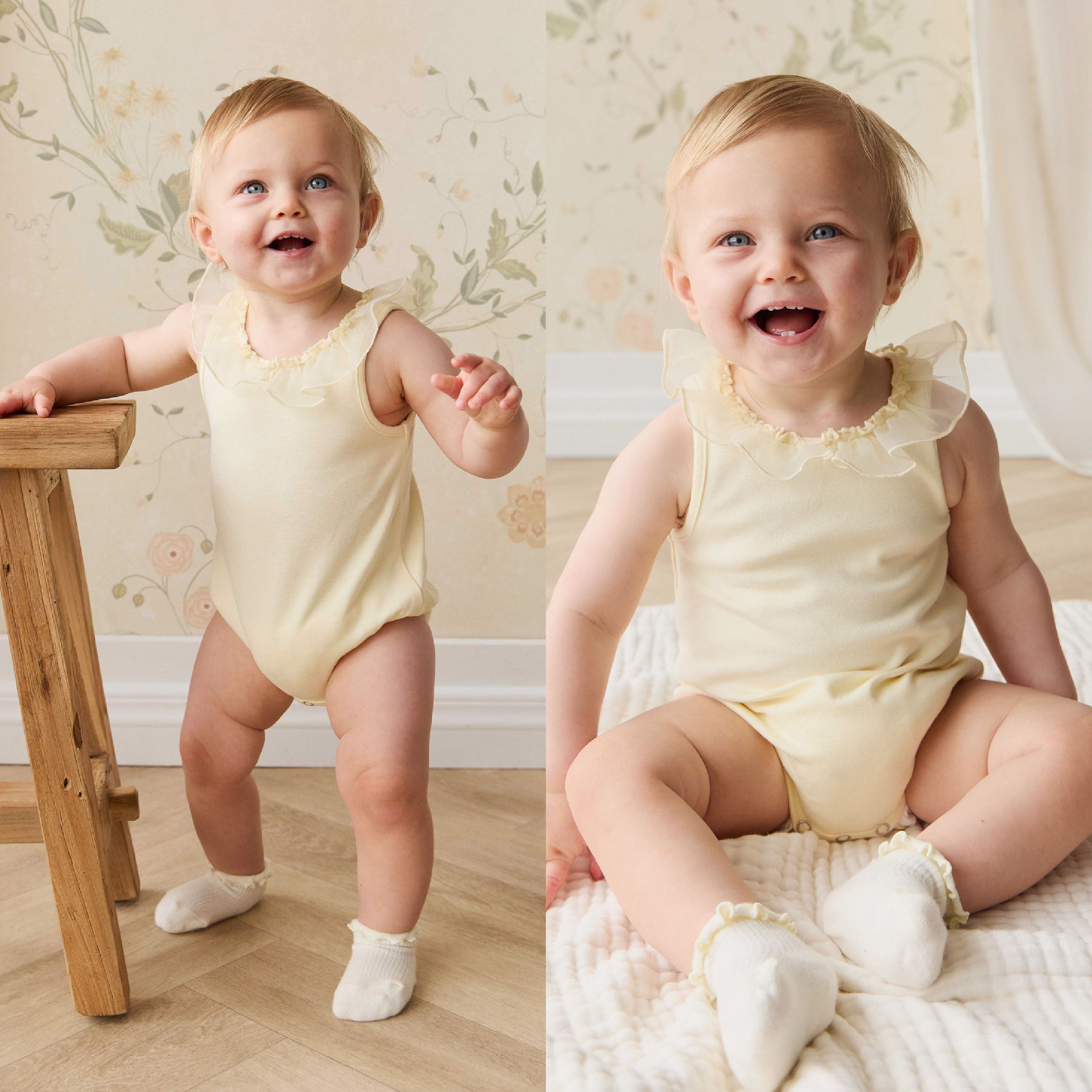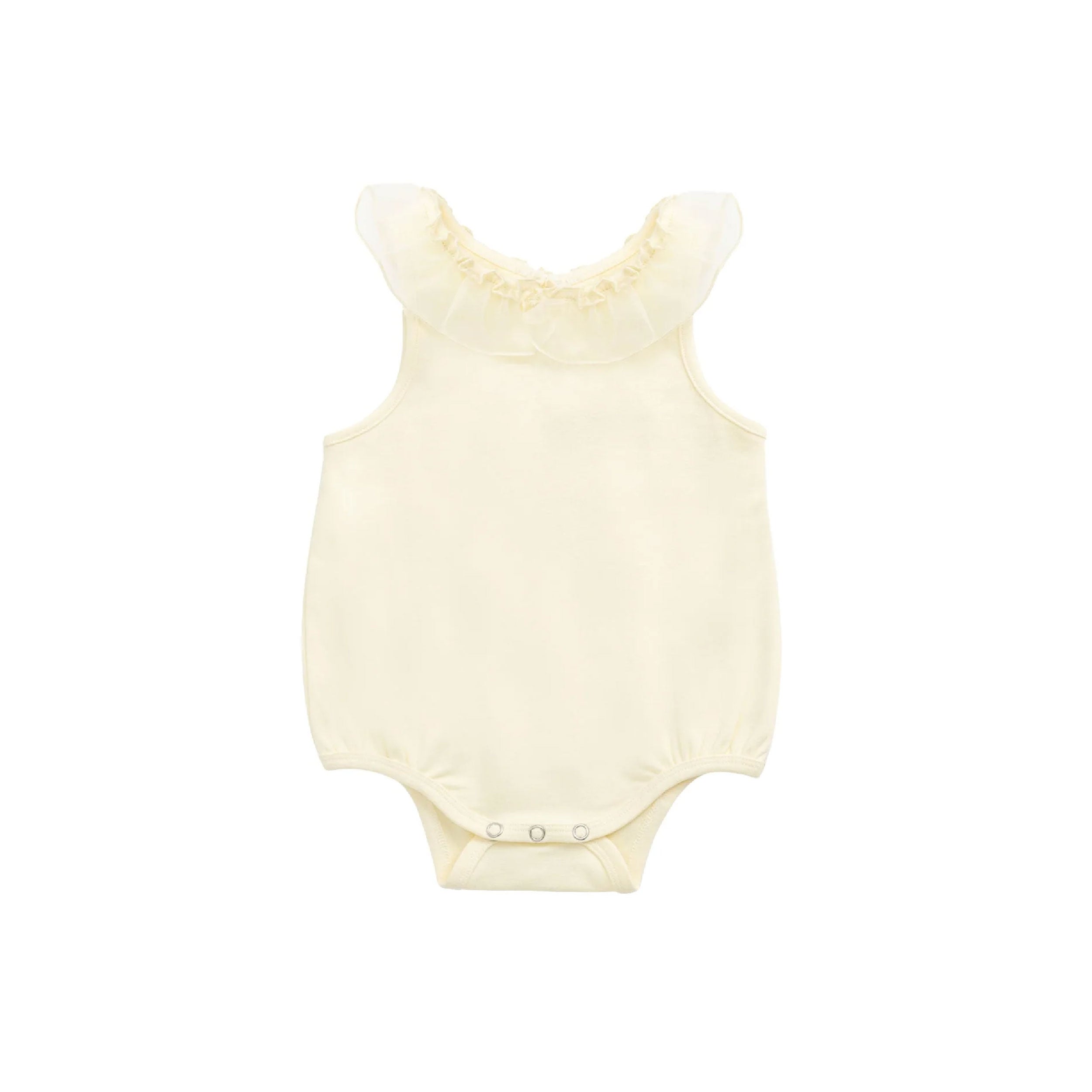 A sweet pastel lemon playsuit designed for comfort and charm. Featuring a ruffle neckline and lower back detail, this sleeveless style is perfect for warm days and special moments.
