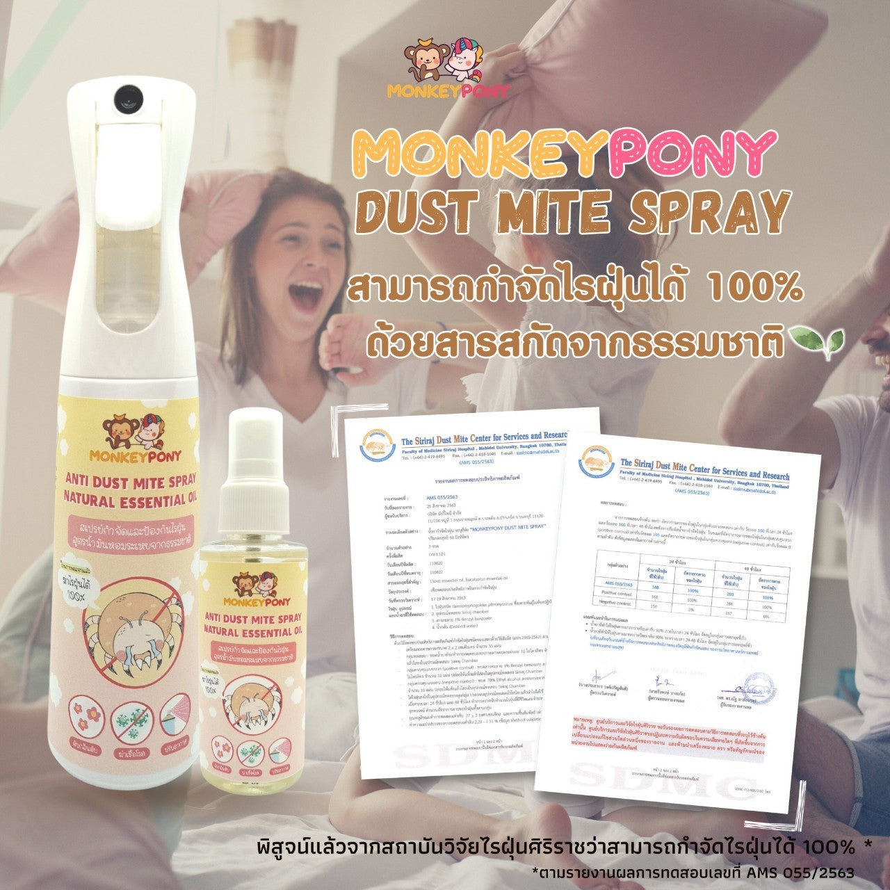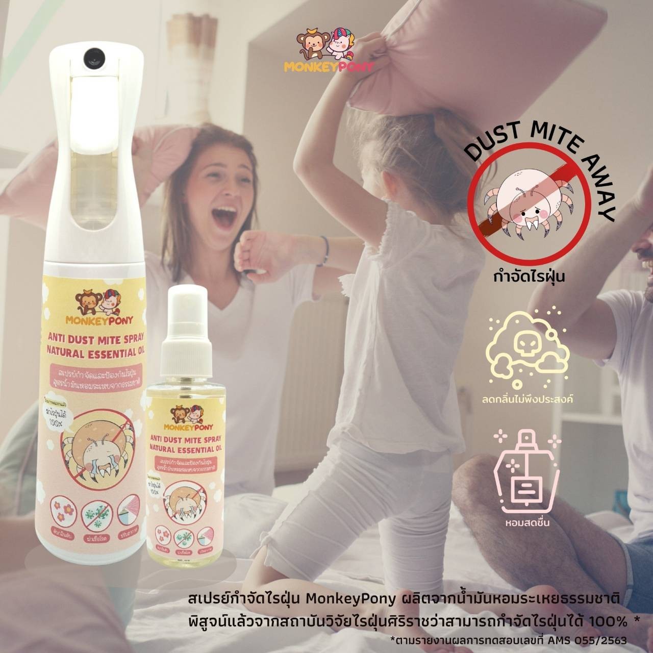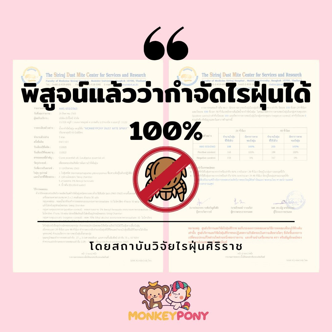 - สเปรย์กำจัดไรฝุ่น MonkeyPony พิสูจน์แล้วจากสถาบันวิจัยไรฝุ่นศิริราชว่ากำจัดไรฝุ่นได้ 100 %