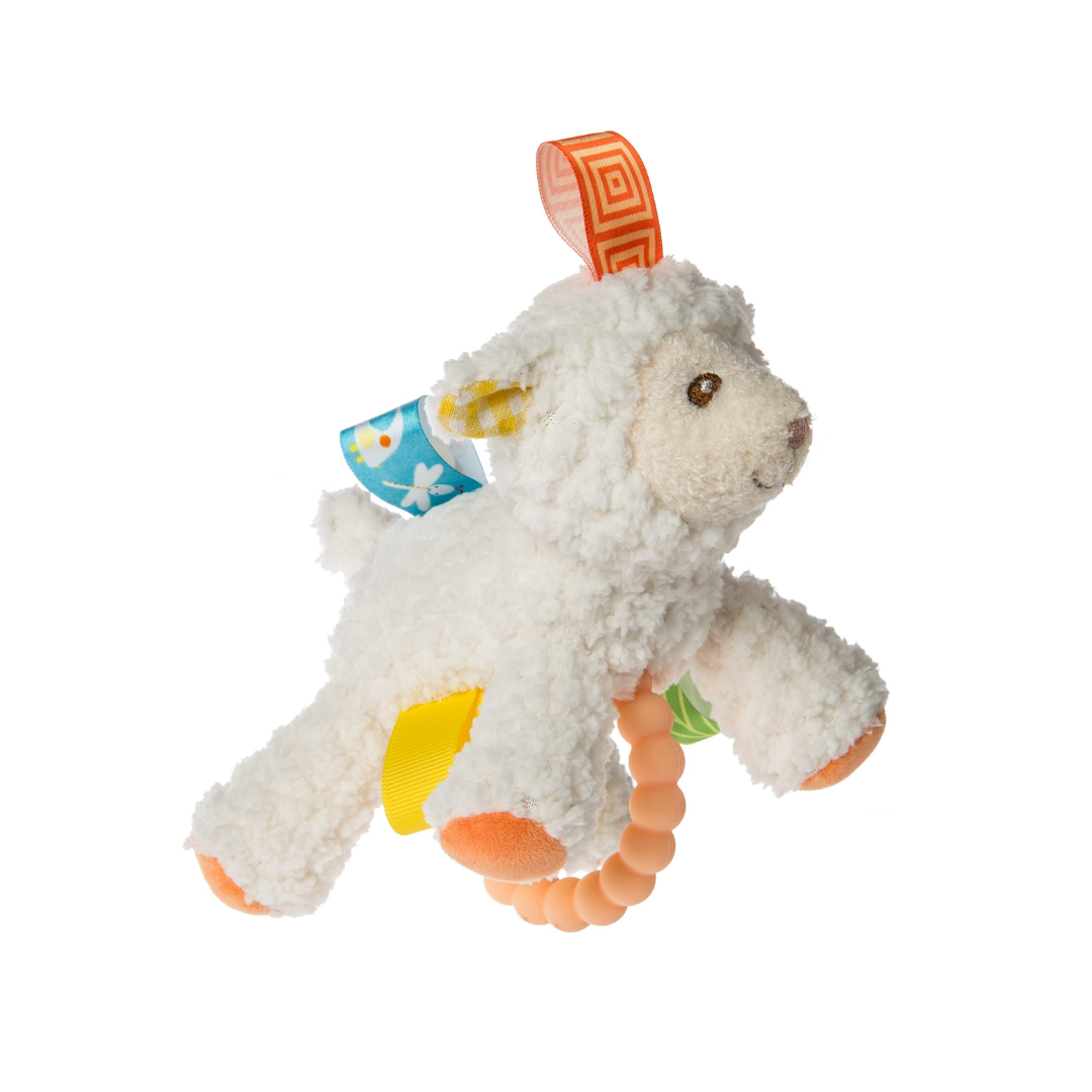 A rattle on the inside, and a silicone teether on the outside make Sherbet Lamb both stimulating and soothing. The perfect size for little hands. Taggies ribbons keeps baby’s interest.