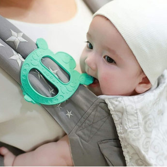 A baby teether designed to support oral development and soothe teething discomfort. Can be securely attached to the straps of baby carriers, stroller harnesses, or car seats.