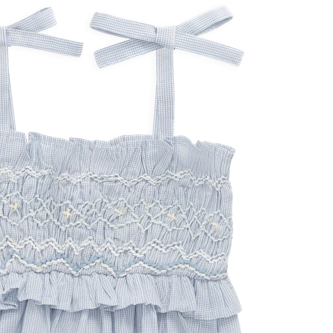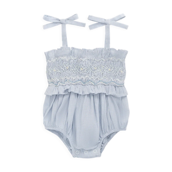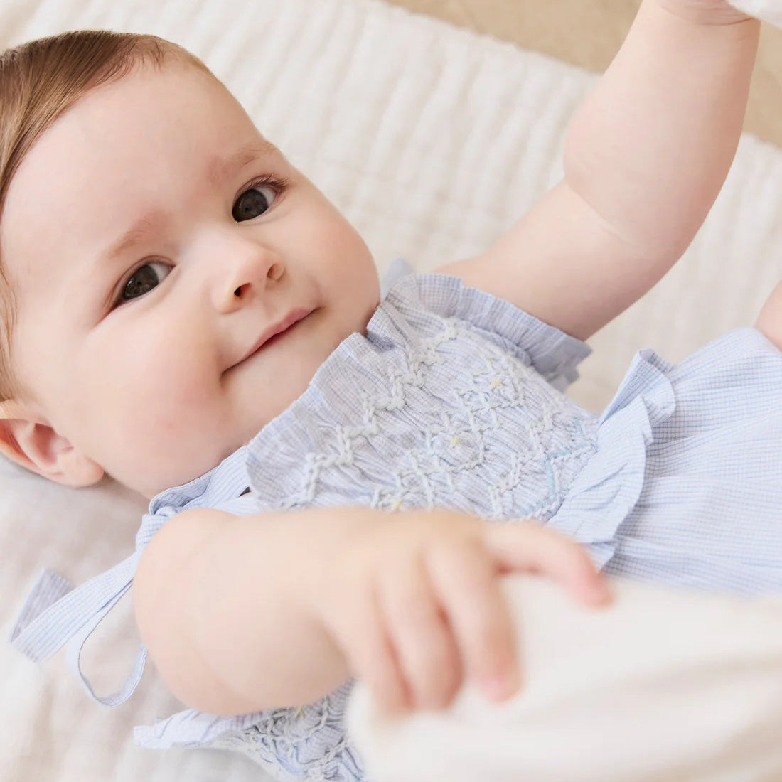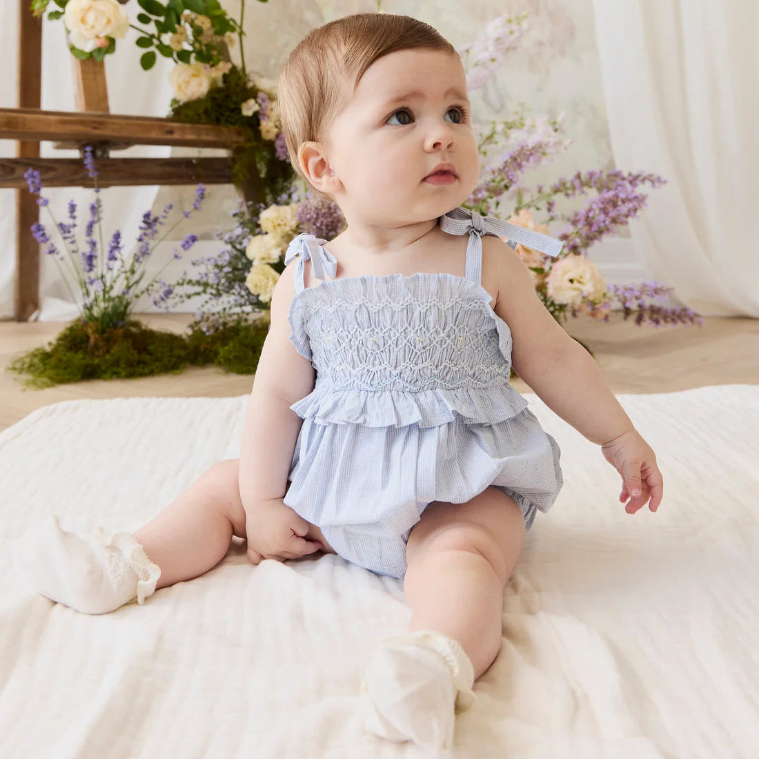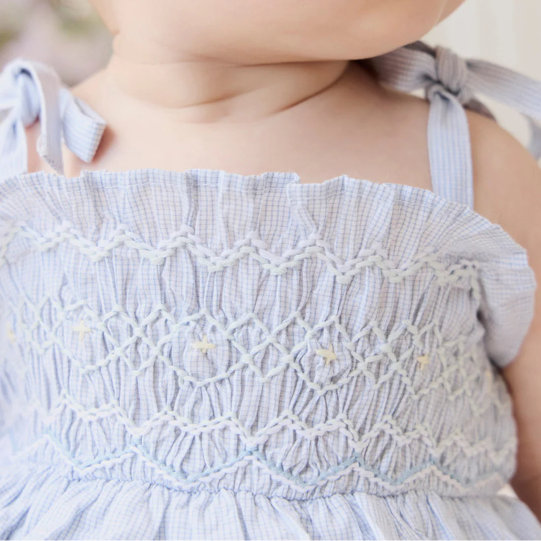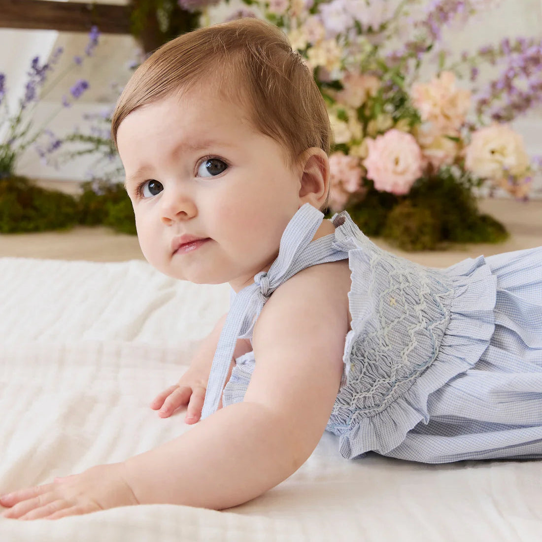 A delicate and timeless piece, the Desiree Playsuit in Petite Check features a beautifully smocked bodice, adjustable tie straps, and a bubble-style bottom with snap closures for easy changing. Perfect for warm days and special moments.