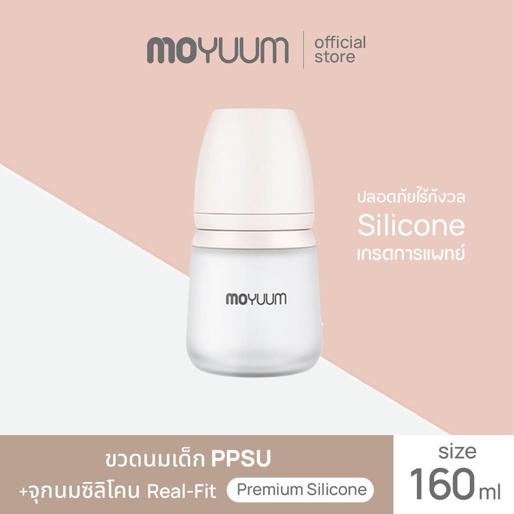 MOYUUM premium silicone baby bottle, 160 ml, comes with a Stage 1 nipple for babies aged 0–2 months. A premium silicone bottle designed to support your baby through every stage of growth.