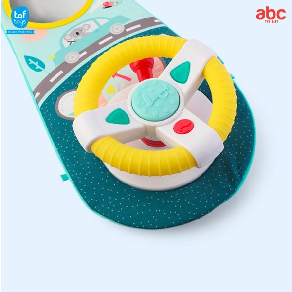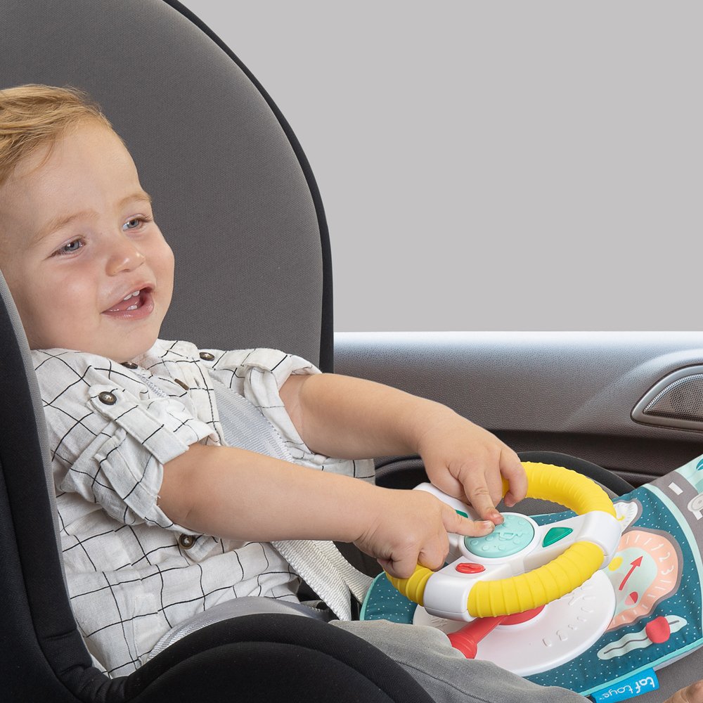 Children can explore various features such as pressing music buttons, spinning the wheel, shifting gears, or looking into the baby-safe mirror.