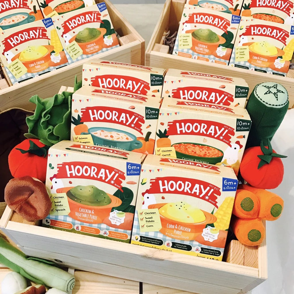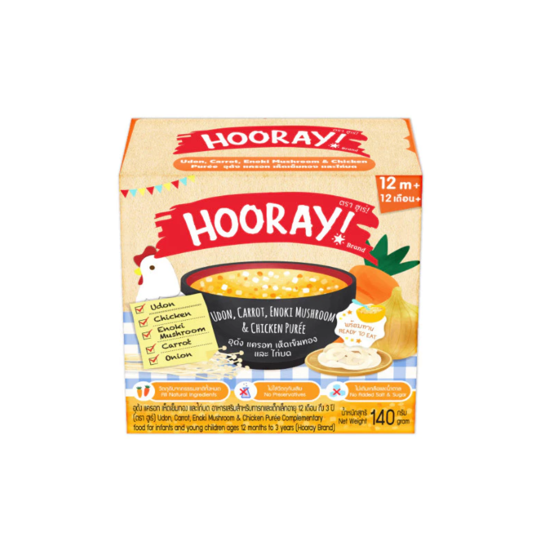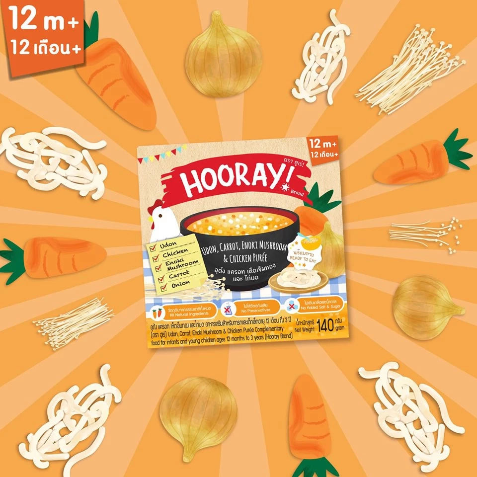 HOORAY! 12 เดือน อาหารเสริมพร้อมทาน อุดัง แครอท เห็ดเข็มทองและไก่บด 140 กรัม เป็นเนื้อบดหยาบ มีชิ้นอาหารนิ่มๆ เพื่อให้คุ้นเคยกับการบดเคี้ยว อาหาร