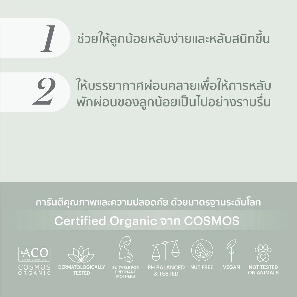 ด้วยส่วนผสมจากธรรมชาติ เช่น Lavender Essential Oil กลิ่นลาเวนเดอร์อ่อนๆ ที่ผ่านการวิจัยมาแล้วว่าช่วยให้ลูกน้อยหลับง่ายและหลับสนิทขึ้น ให้บรรยากาศผ่อนคลายเพื่อให้การหลับพักผ่อนของลูกน้อยเป็นไปอย่างราบรื่น