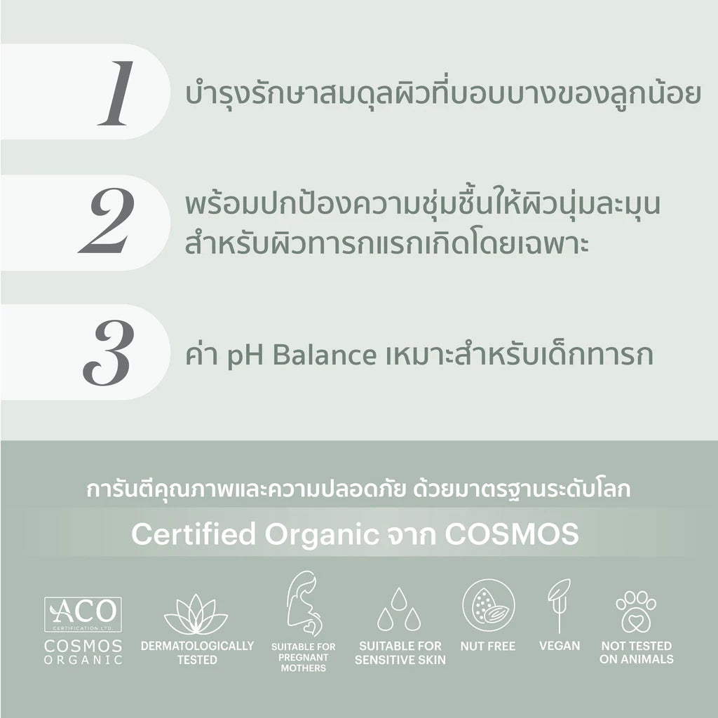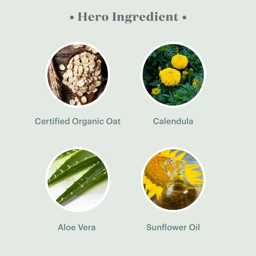 ด้วยสารสกัด Certified Organic Oat และ ดอกคาเลนดูล่า (Calendula) ผสานกับ สารสกัดจากว่านหารจระเข้ และน้ำมันดอกทานตะวัน บำรุงรักษาสมดุลผิวที่บอบบางของลูกน้อย พร้อมปกป้องความชุ่มชื้นให้ผิวนุ่มละมุน พัฒนาและคิดค้นสำหรับผิวทารกแรกเกิดและเด็กเล็กโดยเฉพาะ เพื่อเสริมสร้างผิวให้แข็งแรงสุขภาพดีด้วยส่วนผสมที่คัดสรรจากธรรมชาติ ส่งตรงจากประเทศออสเตรเลีย