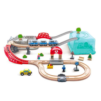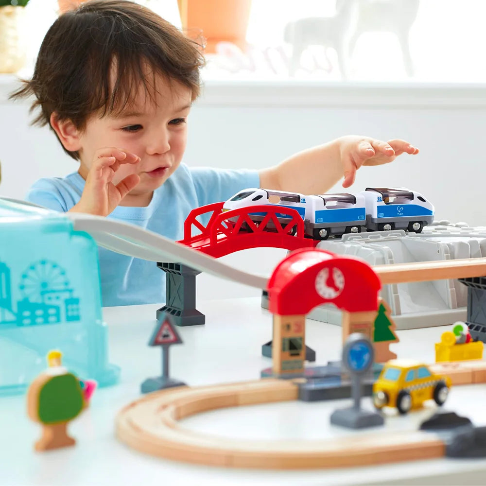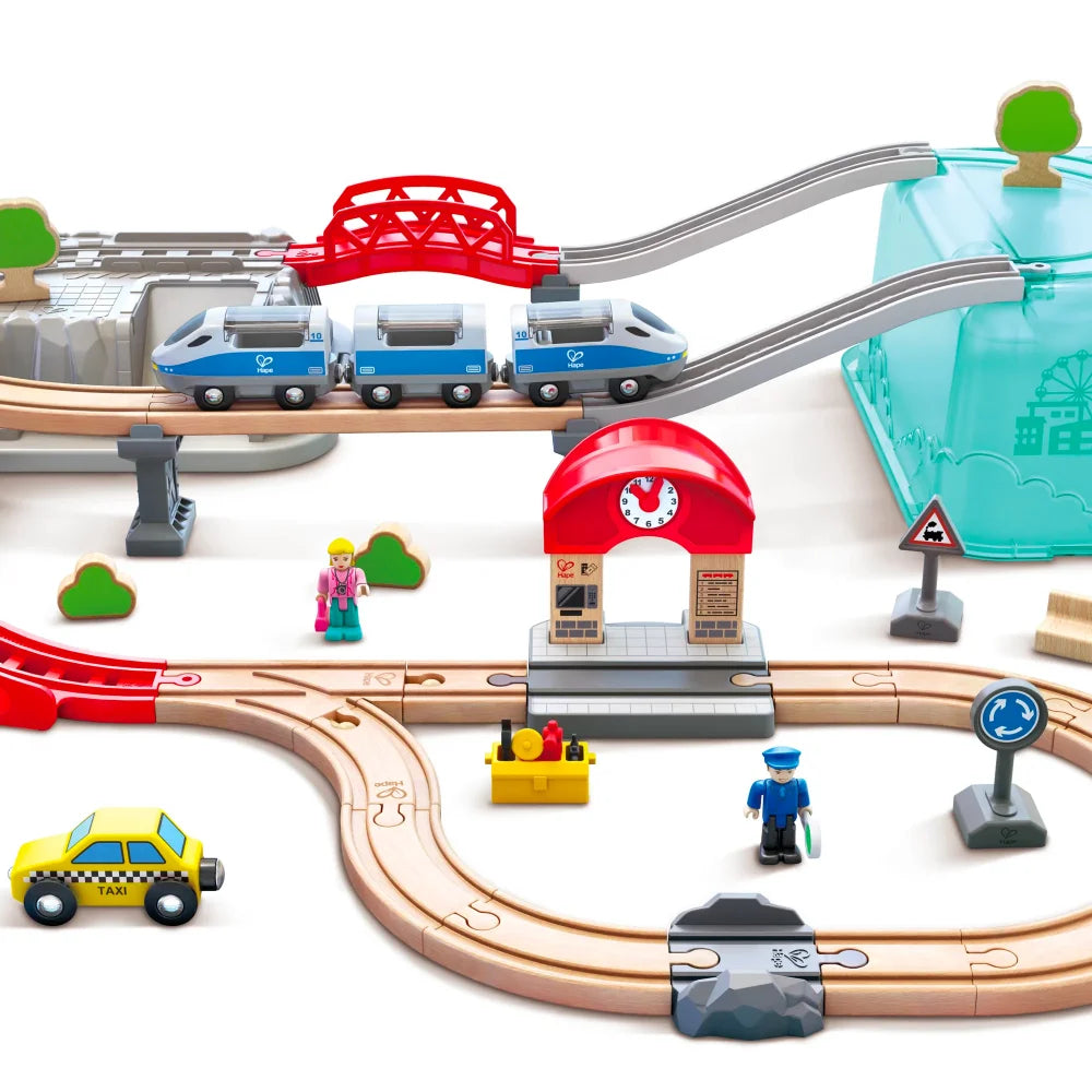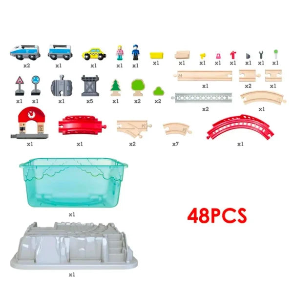 ● ของเล่นรถไฟ 48 ชิ้น เสริมทักษะการสร้างในชุดประกอบด้วย รถไฟ 3 ขบวน, ราง S 2 ชิ้น, Y 2 ชิ้น, โค้ง 8 ชิ้น, รางตรง 4 ชิ้น, รางขึ้นสะพาน, เสา 5 เสา, สถานีรถไฟ, ต้นไม้ 5 ต้น, Taxi, เก้าอี้, รางพลาสติกสีเทา, ป้ายจราจร 2 ป้าย, ชั้นวางเครื่องมือพร้อมเครื่องมือ 6 ชิ้น, นายสถานี, ผู้โดยสาร เเละอื่น ๆ ดูเด็ก ๆ สร้างเมืองรถไฟสุดเจ๋ง มาในรูปแบบมีกล่องเก็บสะดวก พร้อมนำไปเล่นได้ทุกที่ เล่นเข้ากันได้กับรถไฟชุดอื่น ๆ ของ Hape