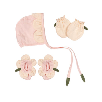 มินิเซตสุดหวาน กับดีไซน์หมวก และถุงมือถุงเท้ากลีบดอกไม้ บนเนื้อผ้าใยเทนเซลที่ละเอียดและนุ่มดุจปุยเมฆ เปลี่ยนลูกน้อยของคุณเป็นดอกไม้สุดสดใส พร้อมรับแสงแดดฤดูร้อน